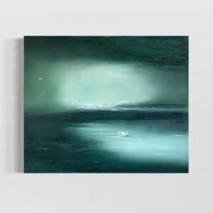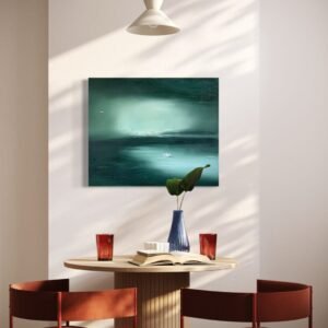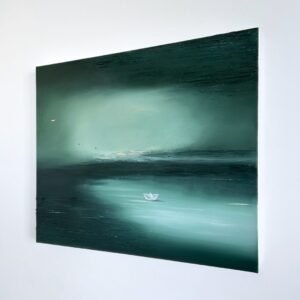 L’atmosfera in questa tela è densa, stratificata, attraversata da una tensione silenziosa.
